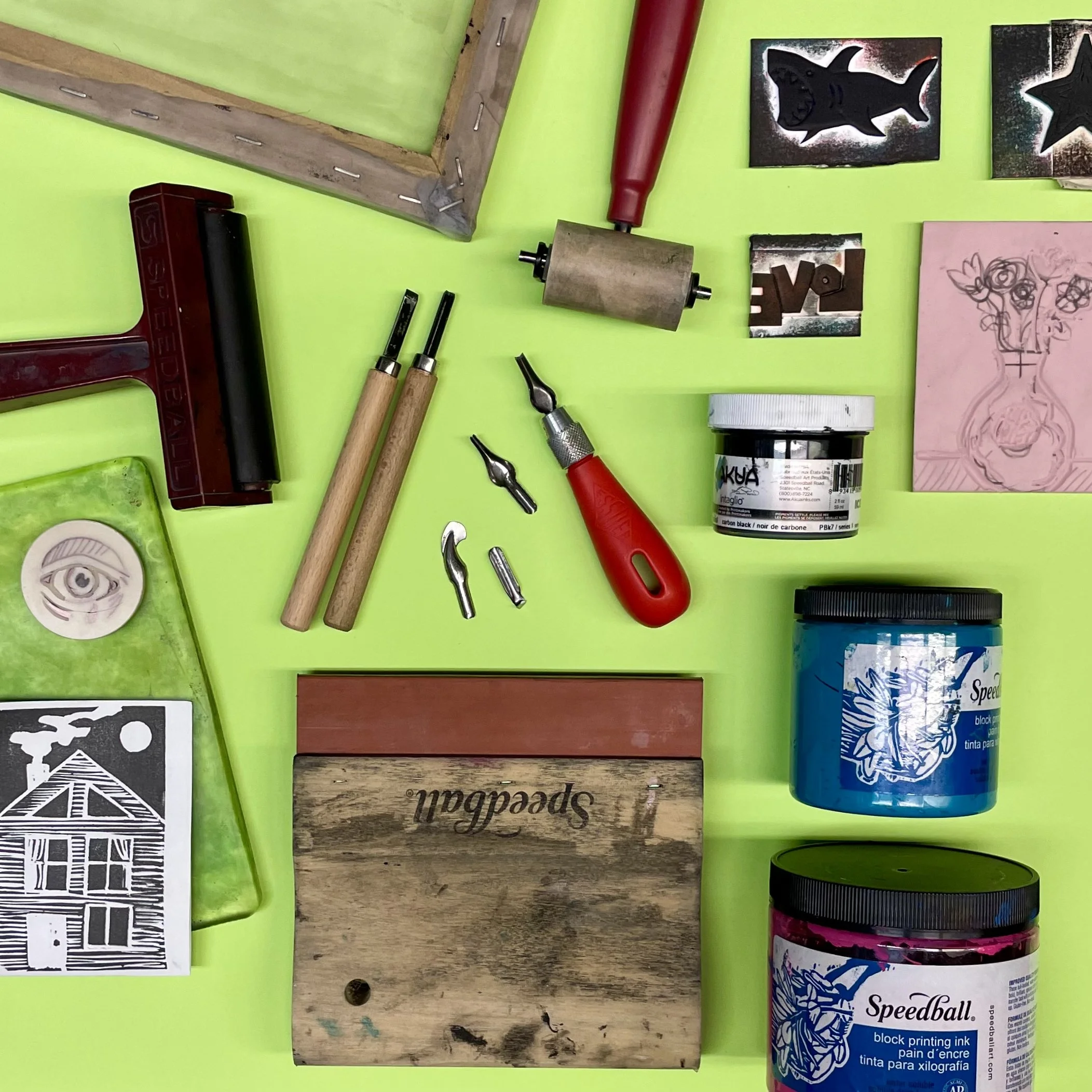 Studio-favourite mediums include painting, printmaking, and textiles. Come try out our button maker or use our collage materials and upcycle some art. Light guidance and all materials will be available for you. Come work on existing projects or start something new.