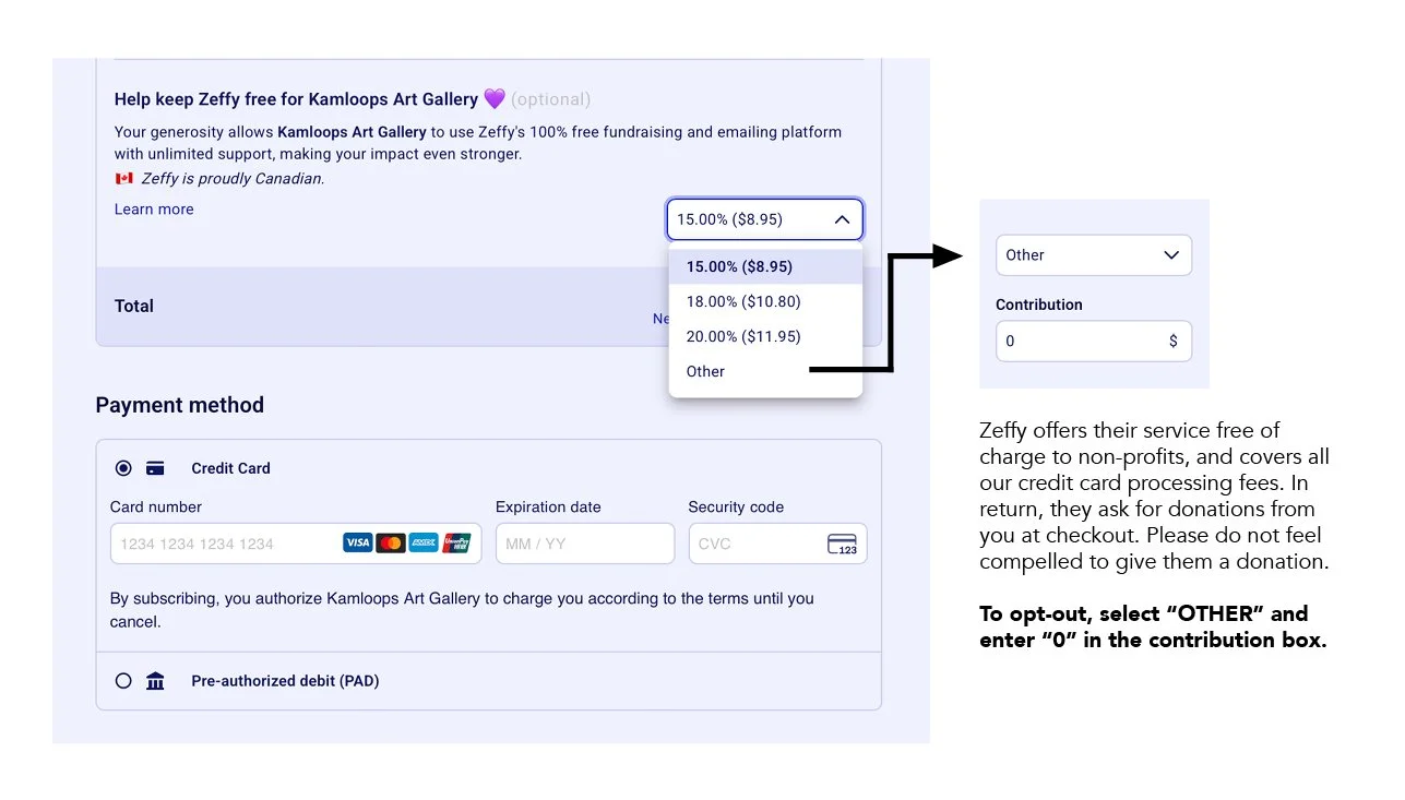 Zeffy is funded through contributions made by donors at checkout - these are 100% optional. See the diagram below for how to opt-out.
